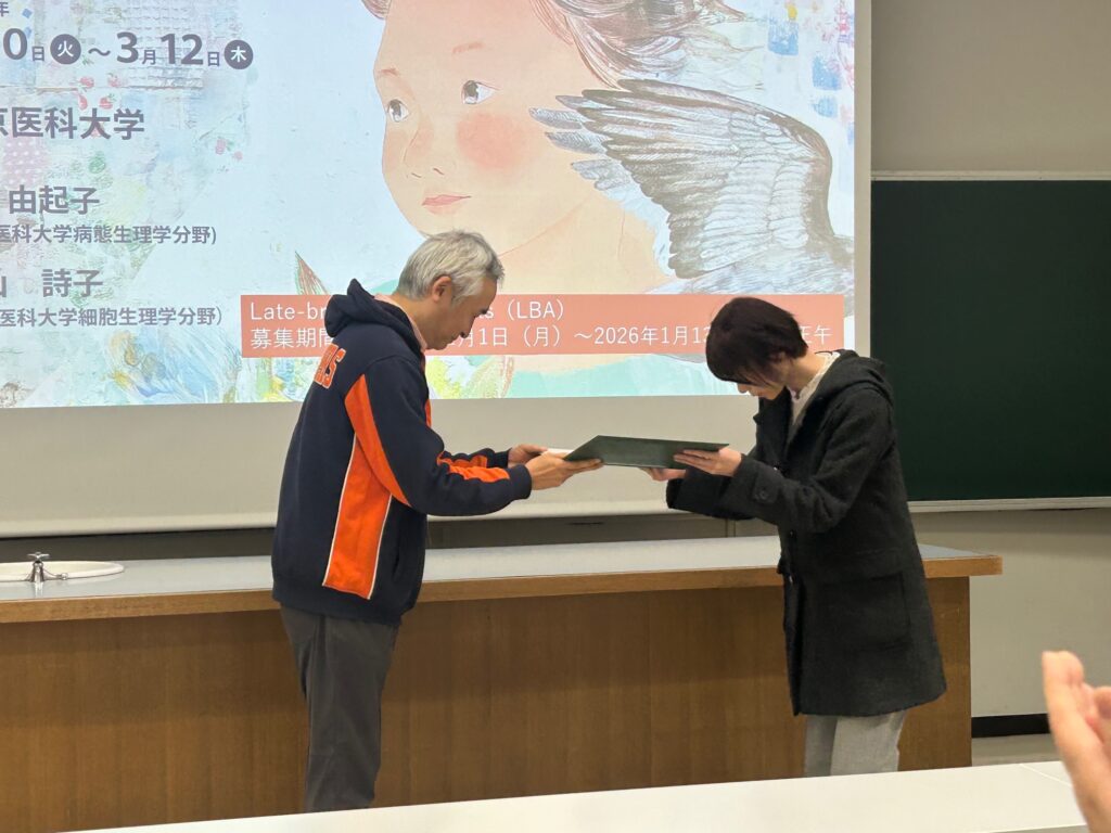 大学院博士課程3年の真栄田有紀さんが、第117回近畿生理談話会で若手優秀賞を受賞しました。